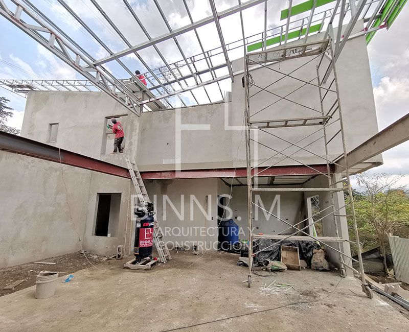 Instalación sistema constructivo COVINTEC en primer y segundo nivel, aplicación de mortero proyectable. Se entregan las paredes con acabado repello fino.