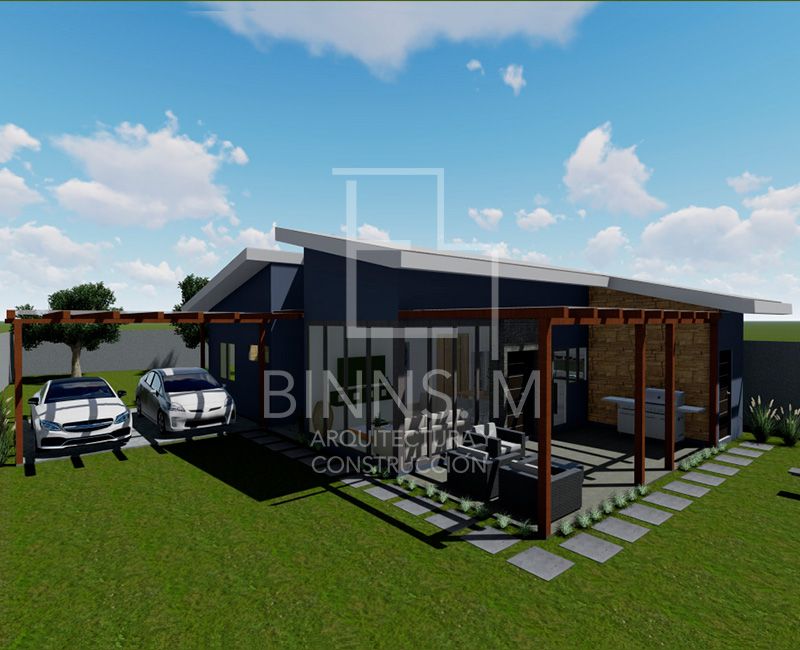 Casa de habitación de 162 m2 diseñada con alturas pronunciadas, área social integrado cocina, comedor, sala y terraza principal e iluminación natural como espacio dirigido para las actividades familiares. Cuentas con área privada hacia la parte posterior del terreno con conexión de ambos dormitorios y estudio con una gran apertura visual, el cuarto principal cuenta con su baño y WC, así como un baño complementario. Espacio de parqueo y bodega para mantenimiento.