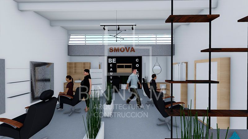 Propuesta de dimensionamiento de espacios para salón de belleza. Se propone una solución con diseño industrial con tubería expuesta y colores neutros. Acentos de color se logran con los muebles y combinación de texturas.